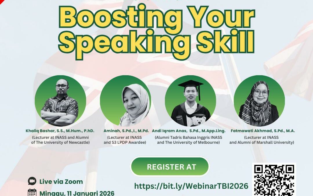 Program Studi Pendidikan/ Tadris Bahasa Inggris (TBI) menyelenggarakan kegiatan webinar bertajuk “ Boosting Your Speaking Skill ” pada 11 Januari 2026. Kegiatan ini dilaksanakan secara daring melalui Zoom Meeting dan terbuka untuk peserta umum. Webinar ini menjadi salah satu upaya akademik untuk meningkatkan minat dan motivasi masyarakat dalam mengembangkan keterampilan berbicara bahasa Inggris dan sosialisasi prodi bagi calon mahasiswa baru.