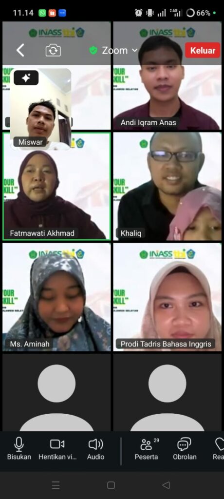 Webinar tersebut menghadirkan tiga narasumber kompeten di bidang pendidikan bahasa Inggris, yaitu Khaliq Bashar, S.S., M.Hum., Ph.D., dosen di Institut ‘Aisyiyah Sulawesi Selatan (INASS) dan alumni The University of Newcastle; Aminah, S.Pd.I., M.Pd., dosen INASS sekaligus penerima beasiswa S3 LPDP Kemenkeu; Andi Iqram Anas, S.Pd., M.App.Ling., alumni Tadris Bahasa Inggris INASS dan alumni The University of Melbourne dengan beasiswa LPDP Kemenkeu juga; serta dimoderatori oleh Fatmawati Akhmad, S.Pd., M.A., Dosen INASS dan alumni Marshall University, Amerika Serikat.